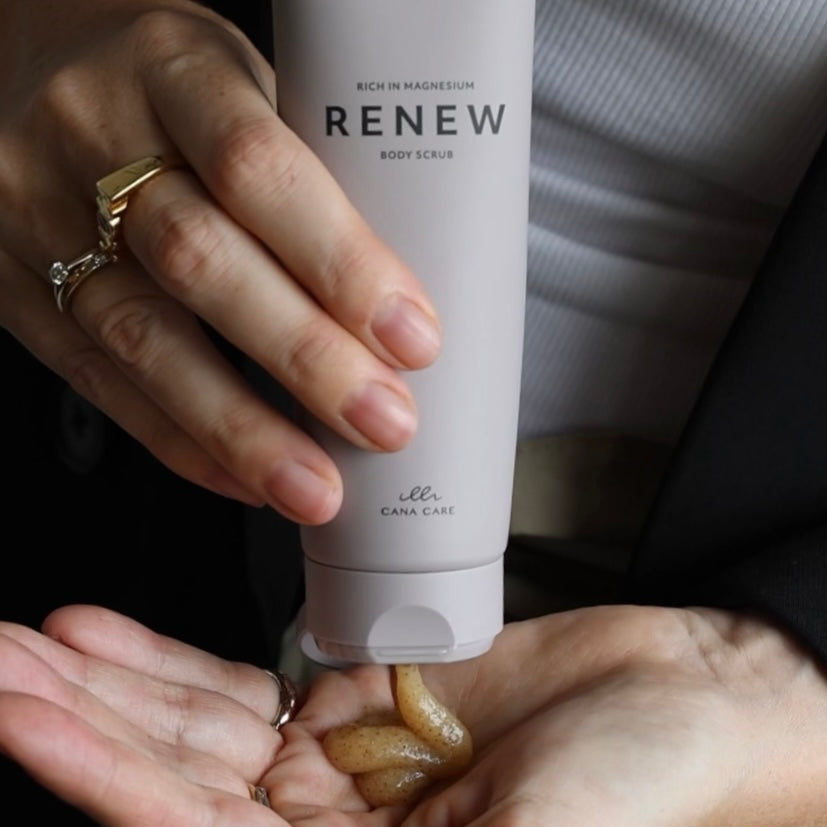 RENEW is a magnesium-infused body scrub that gently exfoliates the skin and removes dead skin cells. The scrub contains cleansing agents that lather into a soft foam when used, with a delightful, mild citrus scent.